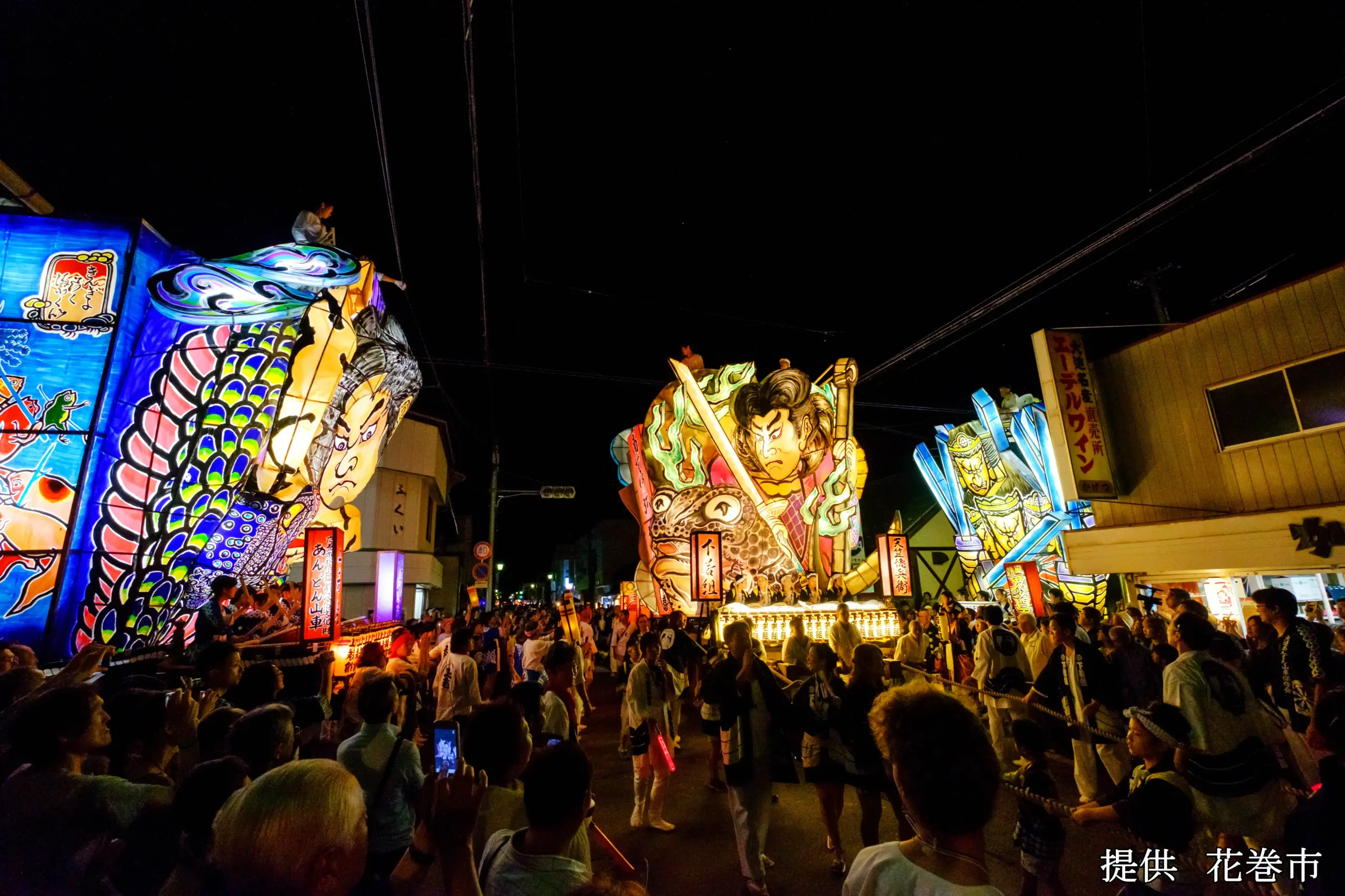 出し物には、武者絵や歌舞伎の題材のほか、先祖供養の仏画などが描かれ、各地区の若者が中心となり、4台の山車が町内を練り歩きます。